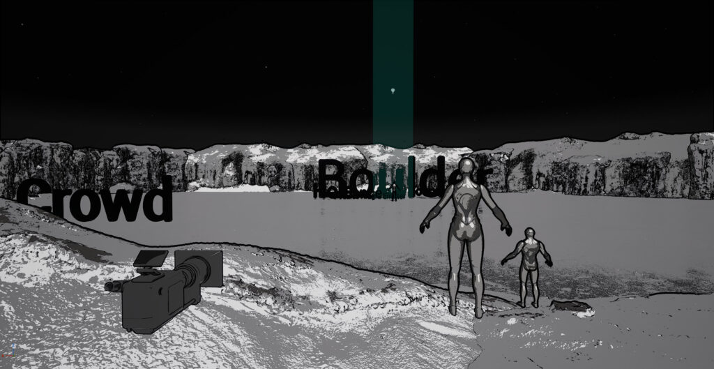 The sky is black because it’s a night scene… but we left the direction light in the sky to light things. Proper lighting will come much, much later. The background is a bunch of Quixel assets. Manny and Quinn have been placed for blocking but not posed. Manny is half-size to represent a child. Props have been placed as big 3D text. They’ll be replaced later with the real thing.